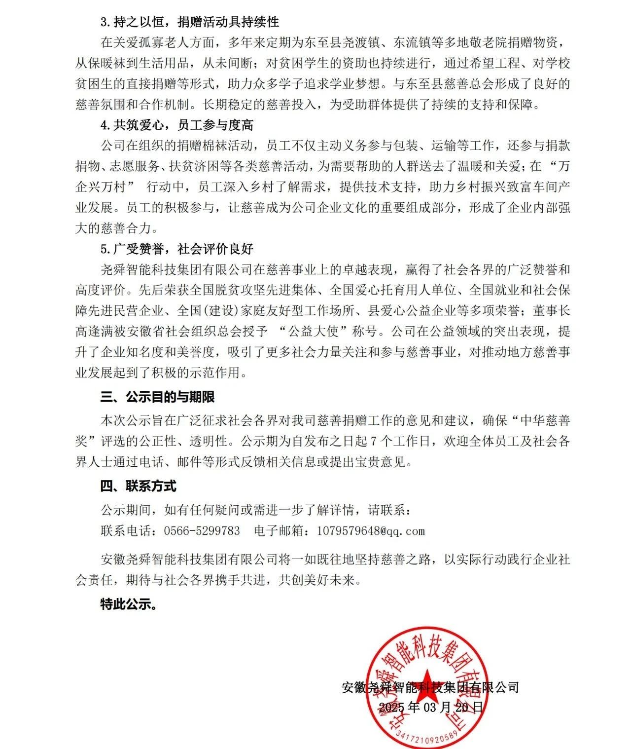 三、、公示目的与期限本次公示旨在广泛征求社会各界对我司慈善捐赠工作的意见和建议,,,确保“中华慈善奖”评选的公正性、、透明性。。。。公示期为自发布之日起7个工作日,,欢迎全体员工及社会各界人士通过电话、、、邮件等形式反馈相关信息或提出宝贵意见。。四、、联系方式公示期间,,如有任何疑问或需进一步了解详情,,请联系:联系电话:0566-5299783 电子邮箱:1079579648@qq.com安徽尊龙时凯智能科技集团有限公司将一如既往地坚持慈善之路,,,,以实际行动践行企业社会责任,,,期待与社会各界携手共进,,,,共创美好未来。。特此公示。。。。安徽尊龙时凯智能科技集团有限公司