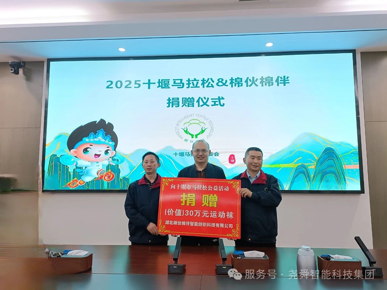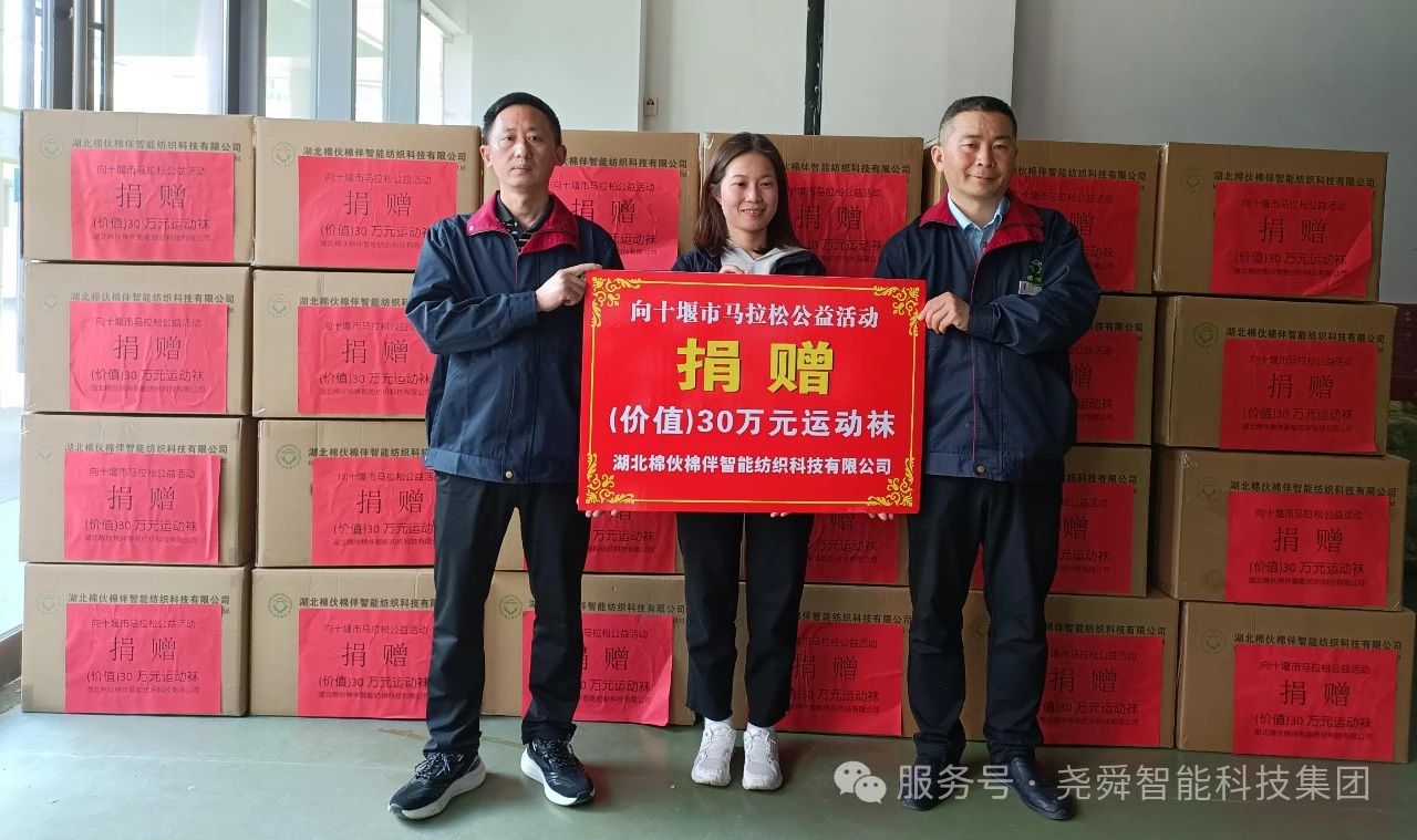 值此盛事,,,,尊龙时凯智能科技集团旗下子公司 —— 湖北棉伙棉伴智能纺织科技有限公司,,以 “科技赋能运动,,,公益传递温暖” 为主题,,向赛事捐赠 30000 双定制运动袜,,,总价值 30 万元,,,为跑者提供专业装备支持,,,助力 “山水车城” 打造体育新名片。。。。这并非棉伙棉伴首次助力体育事业。。2024 年首届十堰马拉松,,,公司便捐赠了价值 20 万元的运动袜,,,,用实际行动支持本土赛事发展。。。。此次加码捐赠,,既是对企业社会责任的延续,,,,也是对 “全民健身” 国家战略的响应。。