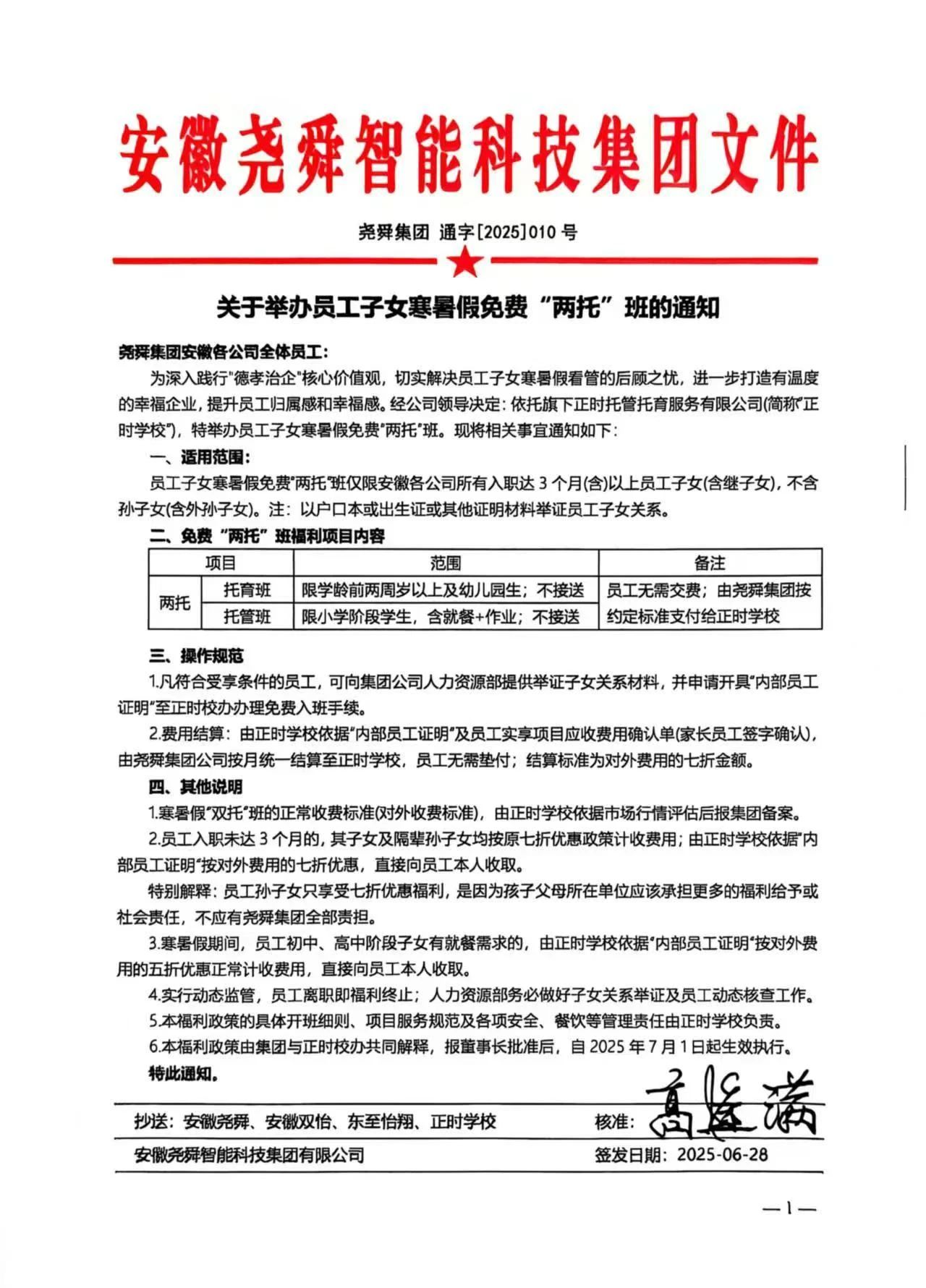 为深入践行“德孝治企”的核心价值观,,切实解决广大员工子女寒暑假期间“看护难”的后顾之忧,,,,全力打造有温度、、、有担当的幸福企业,,,持续提升员工归属感与幸福感,,,,安徽尊龙时凯智能科技集团有限公司重磅推出员工关怀新举措——员工子女寒暑假免费“两托”班!!!依托集团旗下专业的正时托管托育服务有限公司,,让您的孩子假期有处可去、、有人可教、、、、安全无忧!!